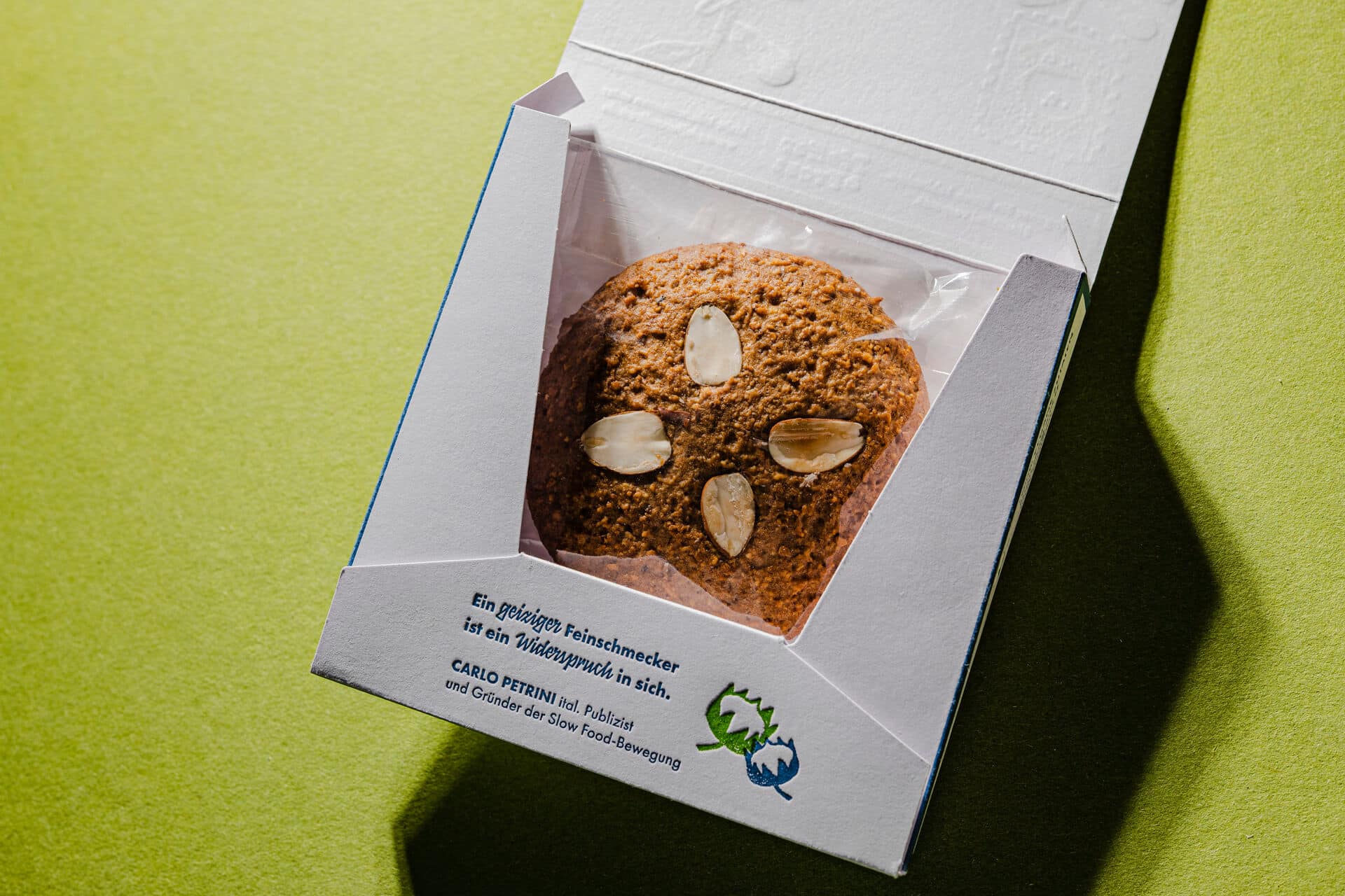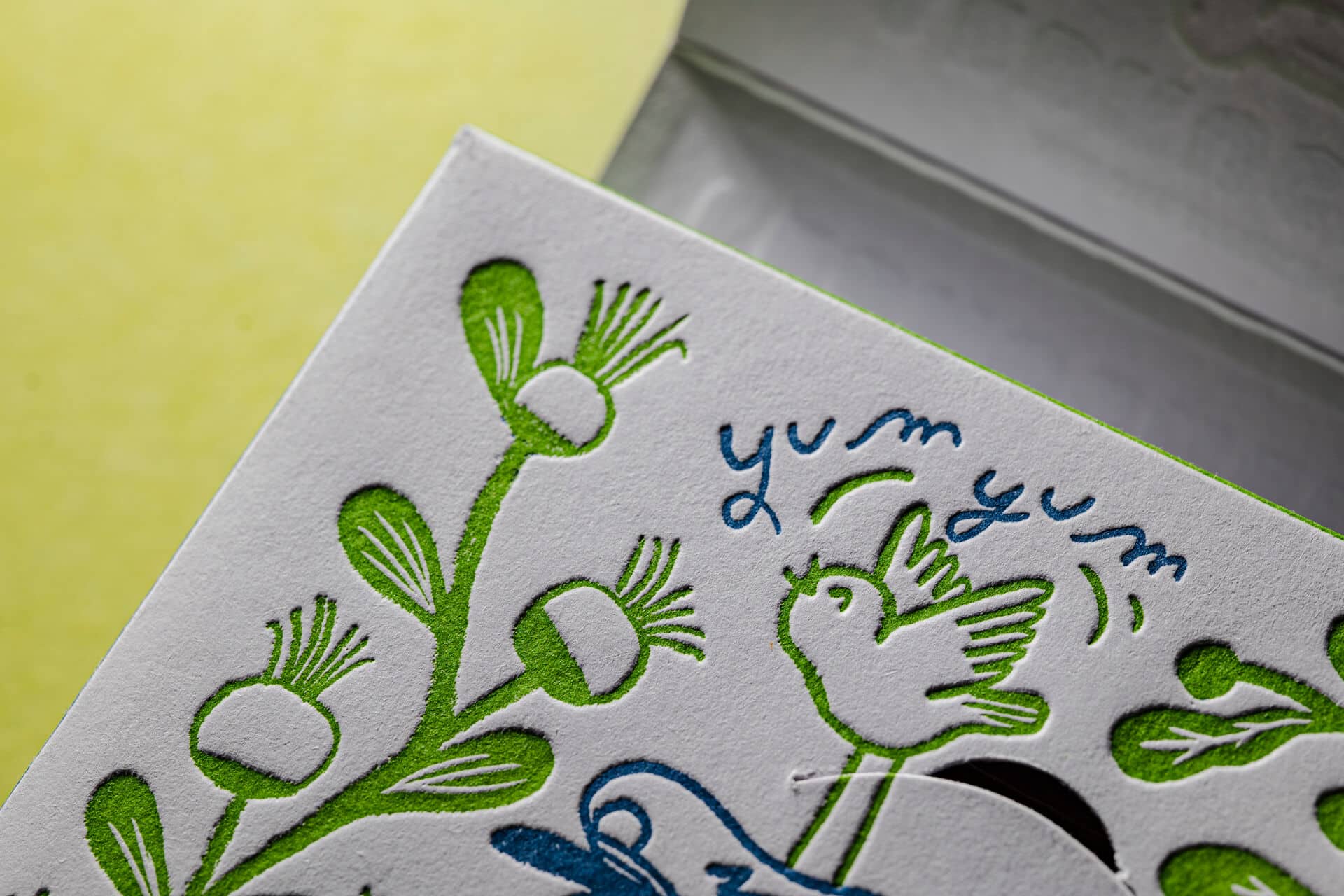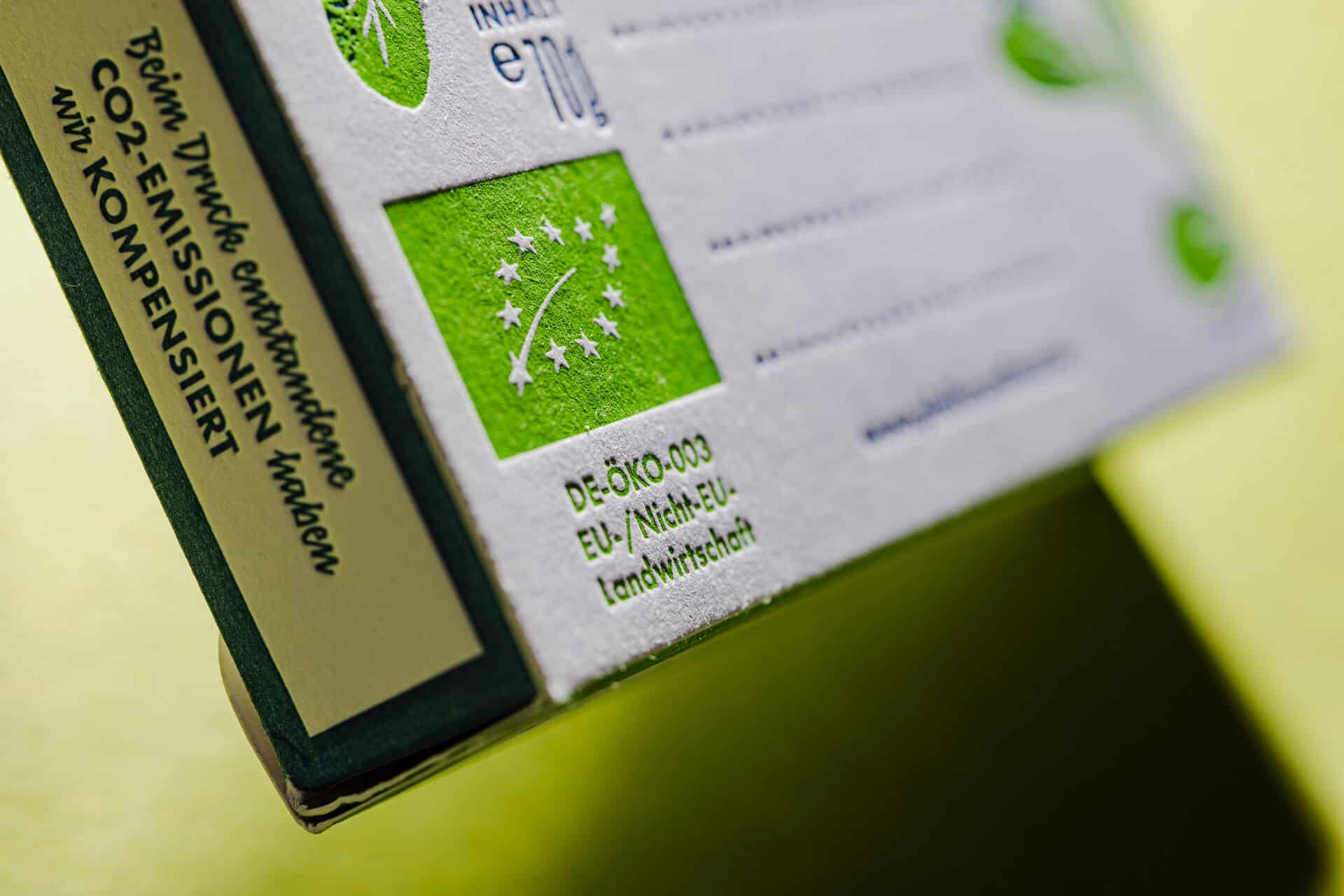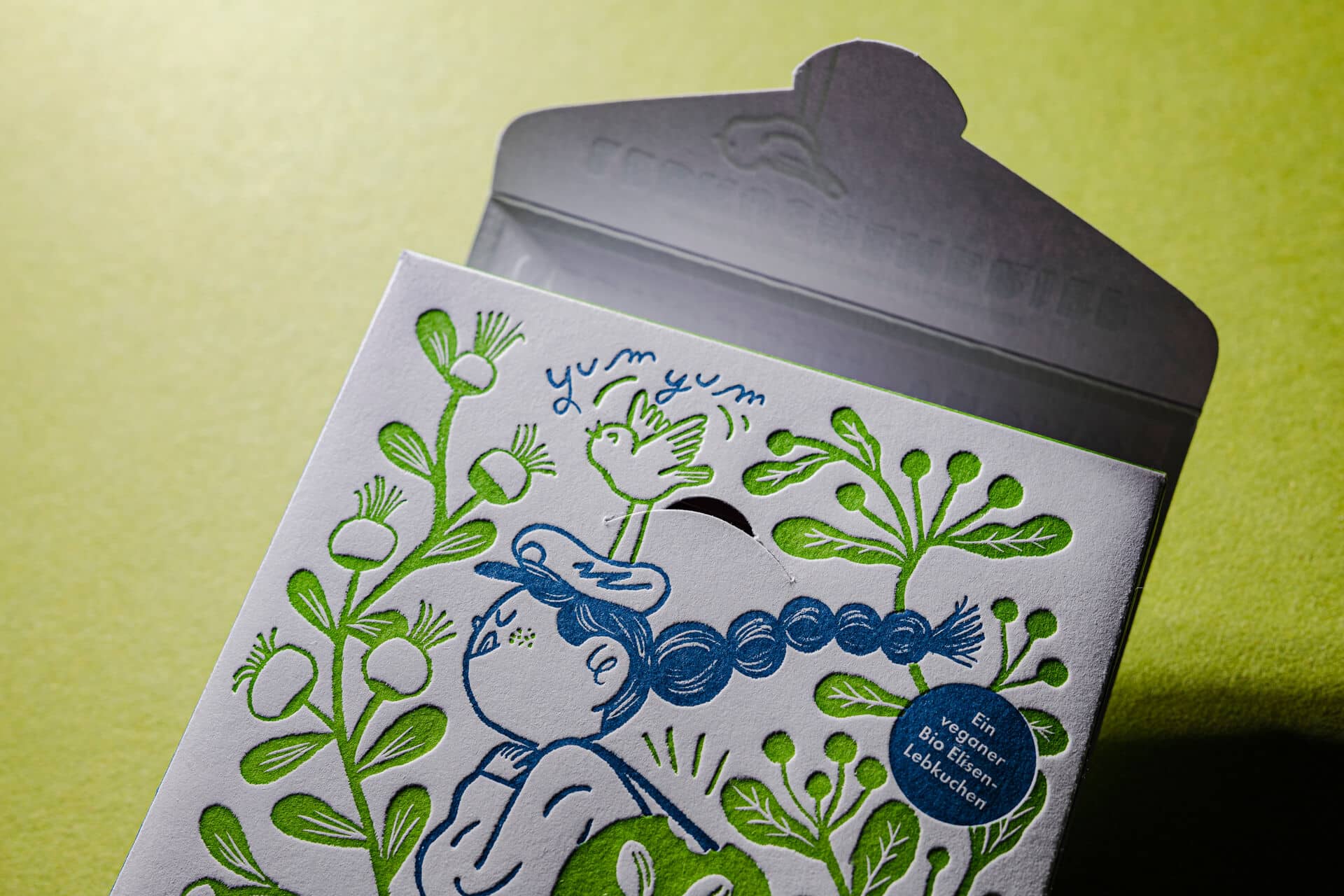 Erschreckend leckere, vegane Lebkuchen hat das junge Unternehmen Pfeffer & Frost aus Nürnberg in einer illustrativ-herzerwärmenden Letterpress-Faltschachtel verpackt. Die deutlich fünfstellige Produktions-Auflage haben wir in drei Arbeitsgängen auf der Maschine zweifarbig Letterpress-gedruckt/geprägt und anschließend gestanzt. Bei Druckfarben und Papierwahl wurde auf eine besonders nachhaltige Produktion geachtet. Der weiße Recycling-Karton stammt aus der schwedischen Fabrik Lessebo, die pro hergestellter Tonne Papier lediglich 22 kg CO2 emittiert (Industrie-Durchschnitt ca. 600 kg). Außerdem kommt die gewählte Art der Faltschachtel ohne Klebstoffe aus. Zu Produktionsbeginn benötigen wir für den Letterpress-Druck nur wenige Bogen Papier, um den Prozess stabil in Gang zu bekommen, insofern ist die Umsetzung auf unserer Maschine (Baujahr 1959) in Sachen Ressourcen-Sparsamkeit erstaunlich zeitgemäß.