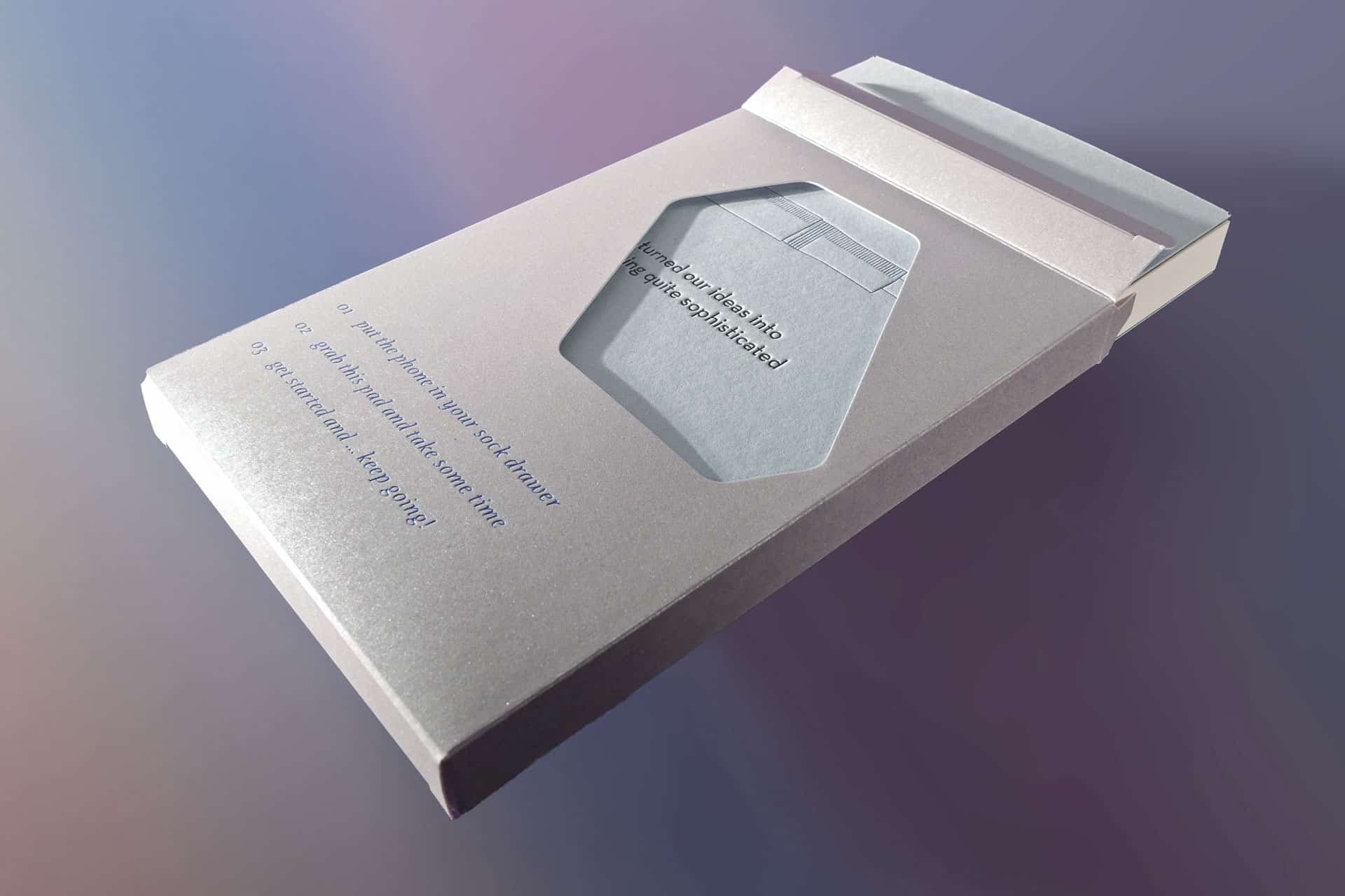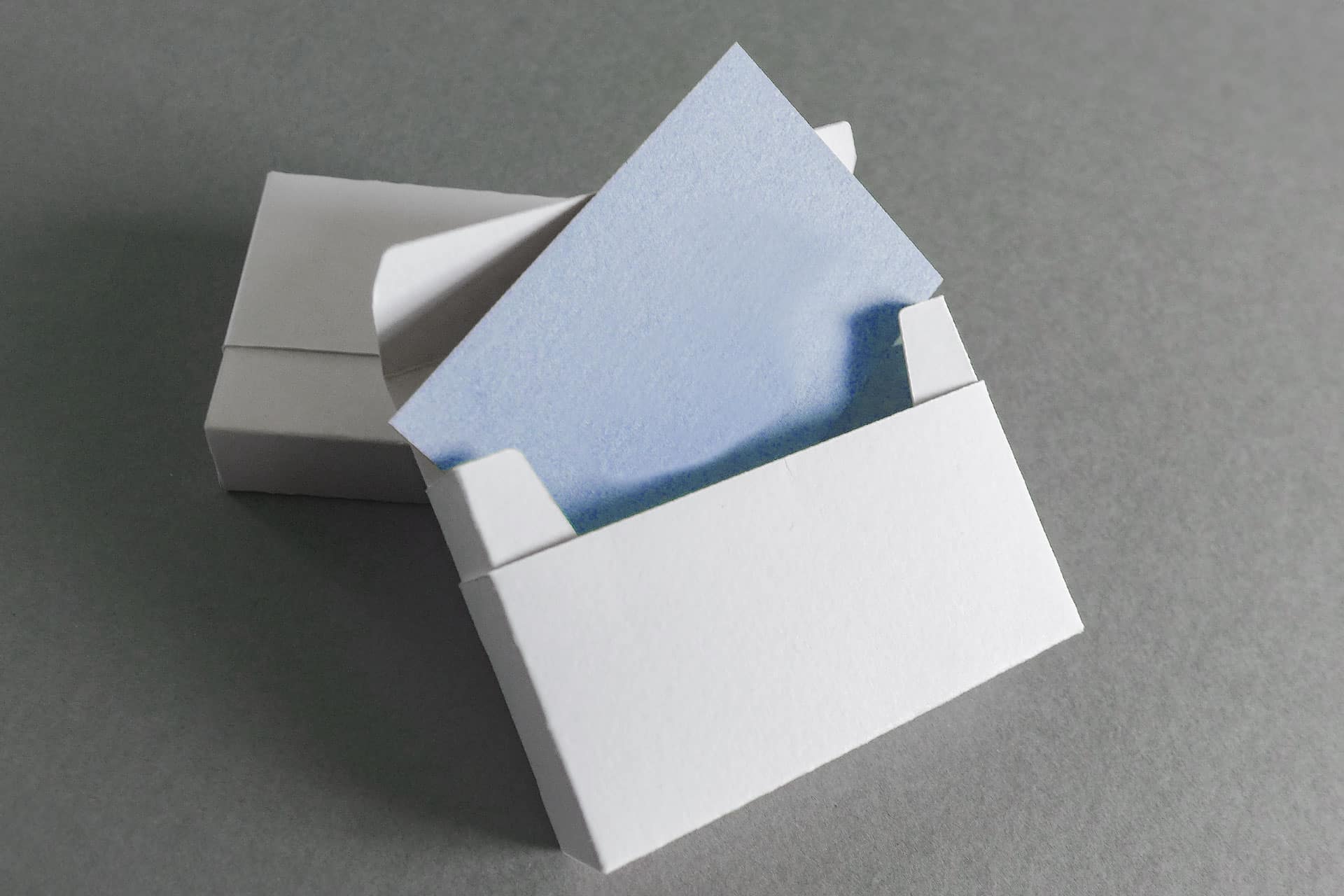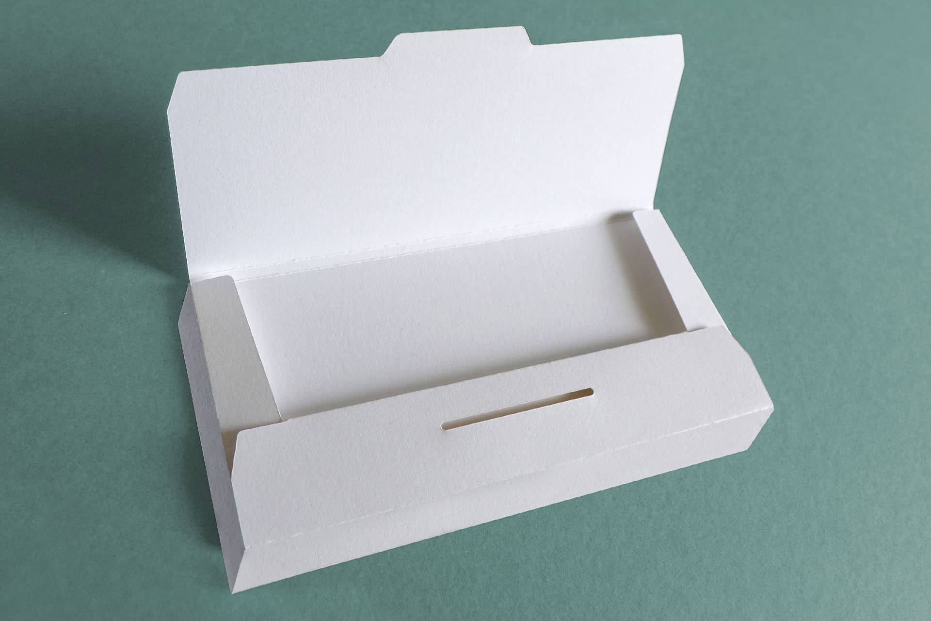 Ein schönes Beispiel für eine wunderbar untypische Faltschachtel. Perfekt für Karten, Untersetzer und andere flache Produkte. Im geschlossenen Zustand wird der Einsteckbereich des Klappdeckels vom Schachtel-Unterteil verborgen, so dass sich die Kartenbox als minimalistisches Objekt präsentiert.