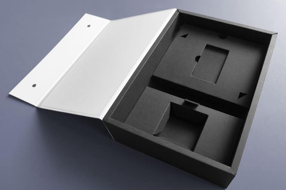 Die luxuriöse Deckelbox für ein Unboxing mit allen Sinnen. Boden-Tray optional mit Hohlrand. Material: hochwertiger Vollkarton bzw. kaschiertes Feinstpapier; alternativ: Premium-F-Welle aus Feinpapier (auch die Wellenbahn besteht aus schwarzem oder weißem Papier). Die Kanten können mit Farbeffekt ausgeführt werden, um beispielsweise die Primärfarbe des Brand Designs zu zitieren.