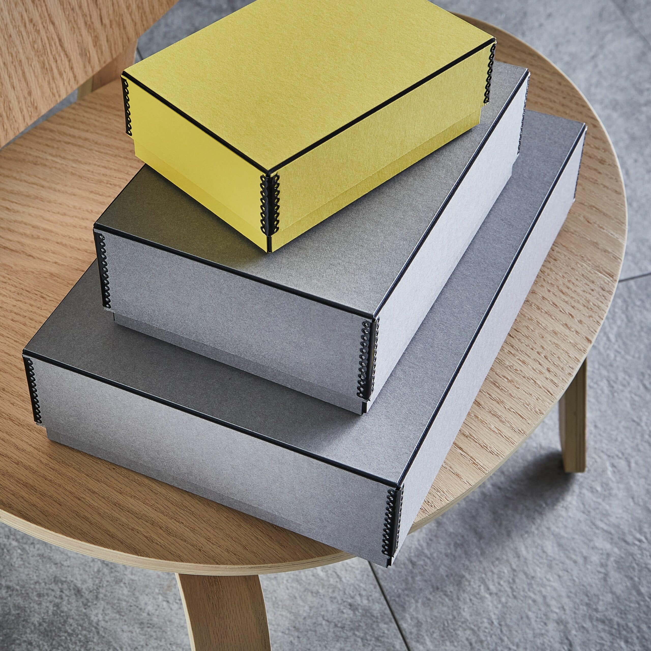 Diese an einen Karteikasten erinnernde Heavy Board Box ist die optimale Variante für »stehende« Produkt-Aufbewahrung, flache Materialmuster oder kartenförmige Publikationen. Für die Art den Klappdeckel zu schließen sind verschiedene Möglichketen machbar: magnetisch, mittels Gummiband durch einen Kartonverschluss oder einen Klick-Verschluss.