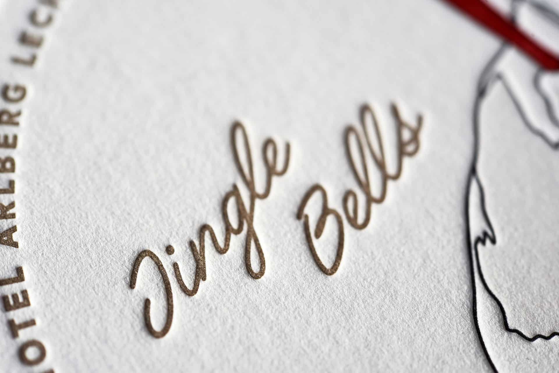 Weihnachtliche Baumschmuck-Aussendung des Hotels Arlberg Lech mit haptischem Naturpapier, Letterpress-Druck und Dackel-Grüßen.