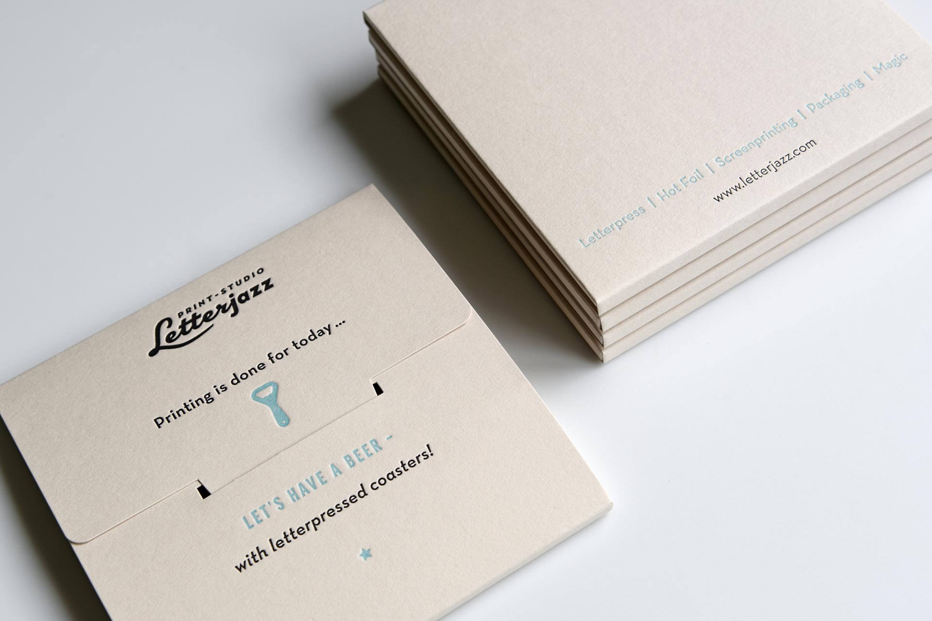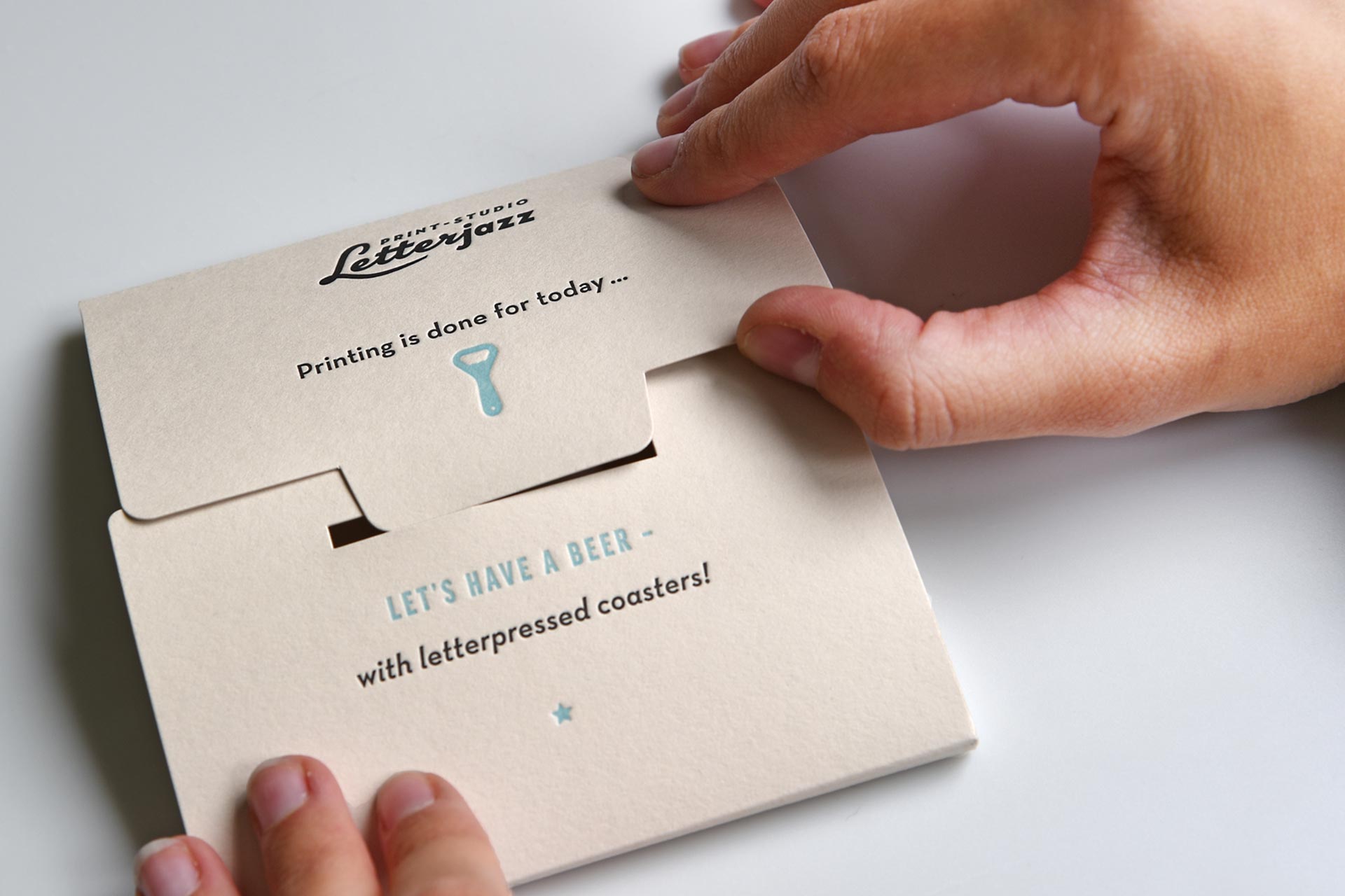 Was geben wir den Besuchern unseres Messestands mit? Ja, natürlich … Bierdeckel, gestaltet von Dirk Uhlenbrock, in einem praktischen Mäppchen. Also dann: letterpressen, stanzen, Mäppchen falzen, konfektionieren, verpacken, in den Lkw laden und los.