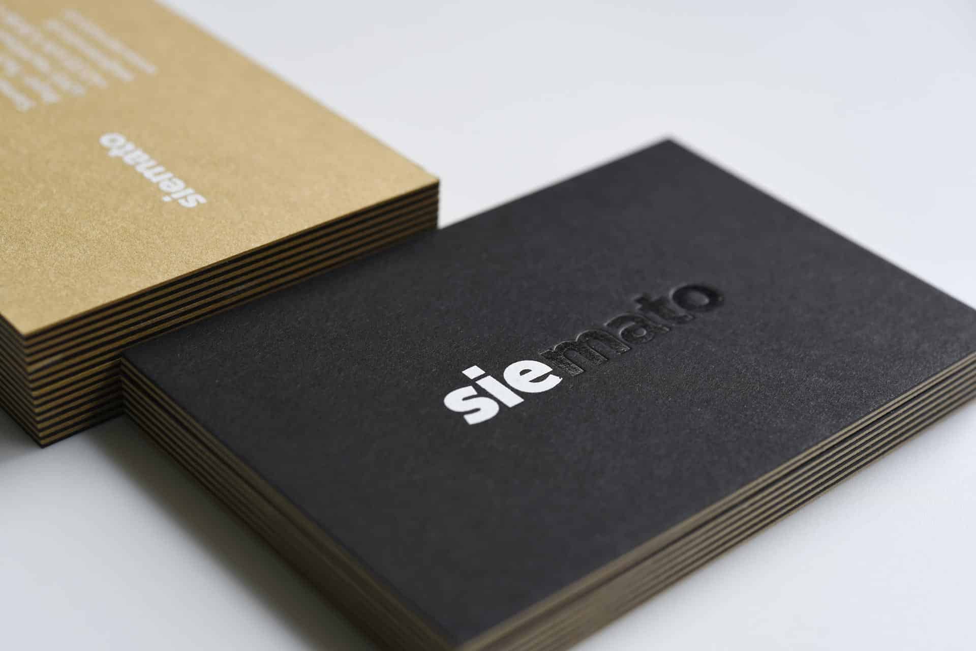 Zutaten für fabelhaftes Print-Design: Farbiges Feinstpapier, Typografie und weißer Siebdruck. Die Visitenkarte erhielt zudem eine Prägung „schwarz-auf-schwarz“ mittels Heißfolie und wurde duplex-kaschiert.