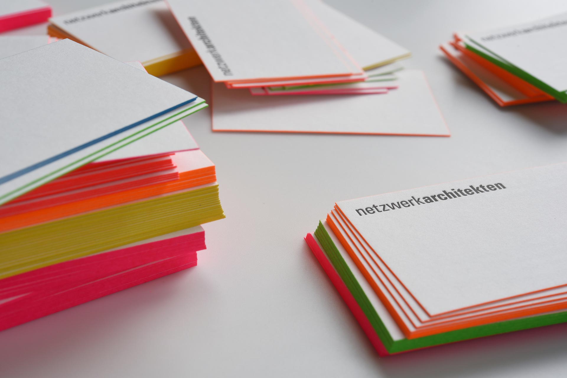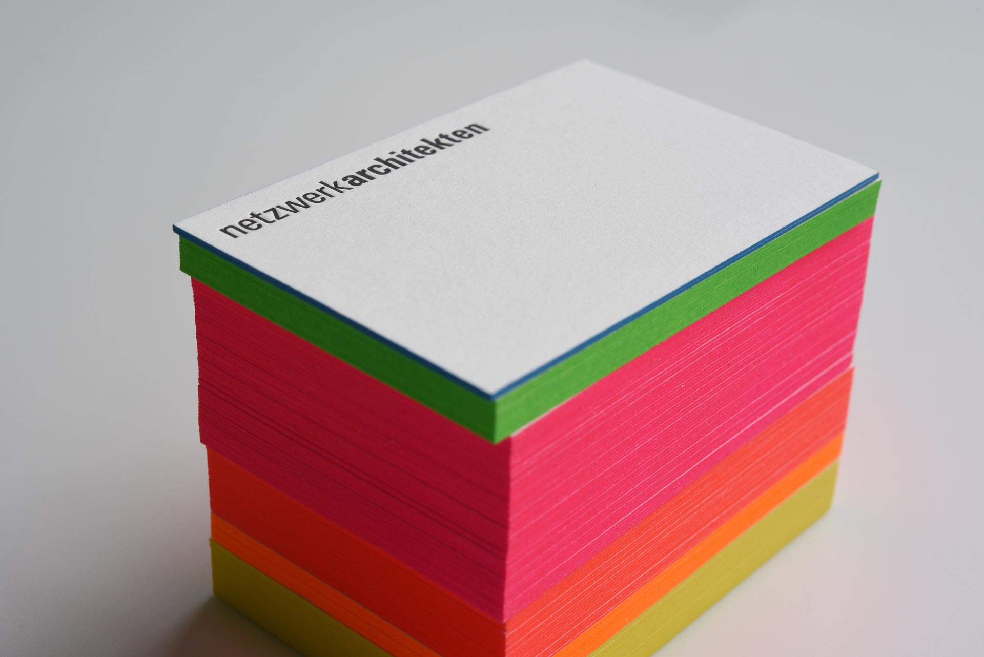 Das Individualitäts-Extra: Letterpress-Visitenkarten mit Farbakzent durch Farbschnitt in sechs unterschiedlichen Pantone-Farben. Agentur: nowakteufelknyrim