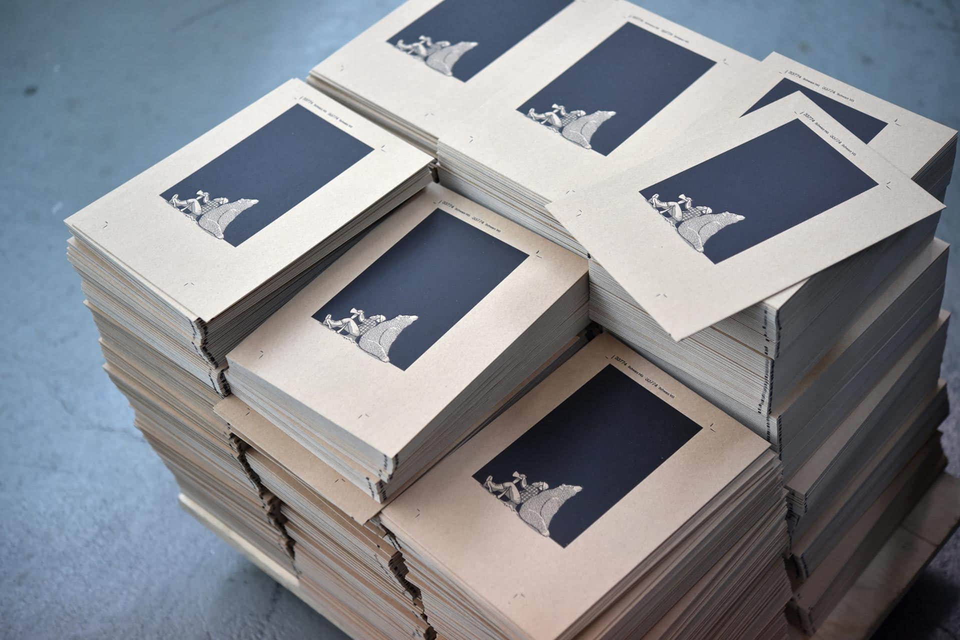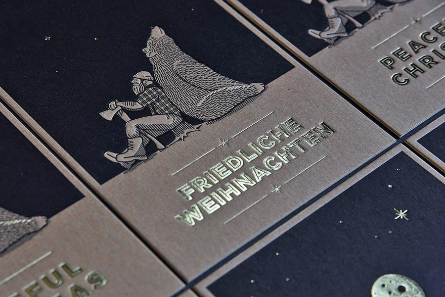 Der schwarze Letterpress-Druck wurde hier in zwei Druckdurchgängen ausgeführt, um den flächigen Hintergrund einerseits und die feineren, illustrativen Elemente andererseits in adäquater Farbführung drucken zu können. Die ergänzende Akzent-Veredelung mittels Heißfolienprägung verleiht dem Druckprodukt seinen Wow-Effekt. Material: KROMA Kraft (700 g/qm) von Kohlschein, Illustration: Jens Robbers, Wuppertal
